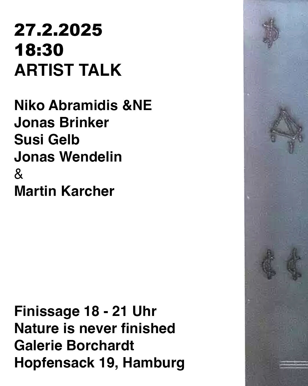 Der Ausstellungstitel „Nature is Never Finished“ basiert auf einem Zitat des US-amerikanischen Land-Art-Künstlers Robert Smithson und präsentiert Werke von fünf Künstler:innen, die sich auf verschiedene Arten mit dem Nicht-Beherrschbaren der Natur sowie der sozialen Dimension von Raum beschäftigen. Die Ausstellung zeigt Videoarbeiten, Malerei, Installation und Skulpturen von Niko Abramidis &NE, Leda Bourgogne, Jonas Brinker, Susi Gelb und Jonas Wendelin.